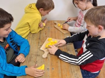 Begrüßung mit Spiel zu unseren Lieblingsbauernhoftieren, Kreislauf von Kalb zu Kuh, Kuhfutter mähen und zusammenheign, selbstgemachten Apfel- und Topfenstrudel zubereiten und mit Vanillesauce jausnen, die Zentrifuge ausprobieren und mit dem gewonnen Schlagobers dann Butter schütteln, Kühe füttern und Melkzeug an der Gummiliesl ausprobieren, Holzbauernhoftiere gestalten und Kuhyoga mit anschließenden Heuhüpfen